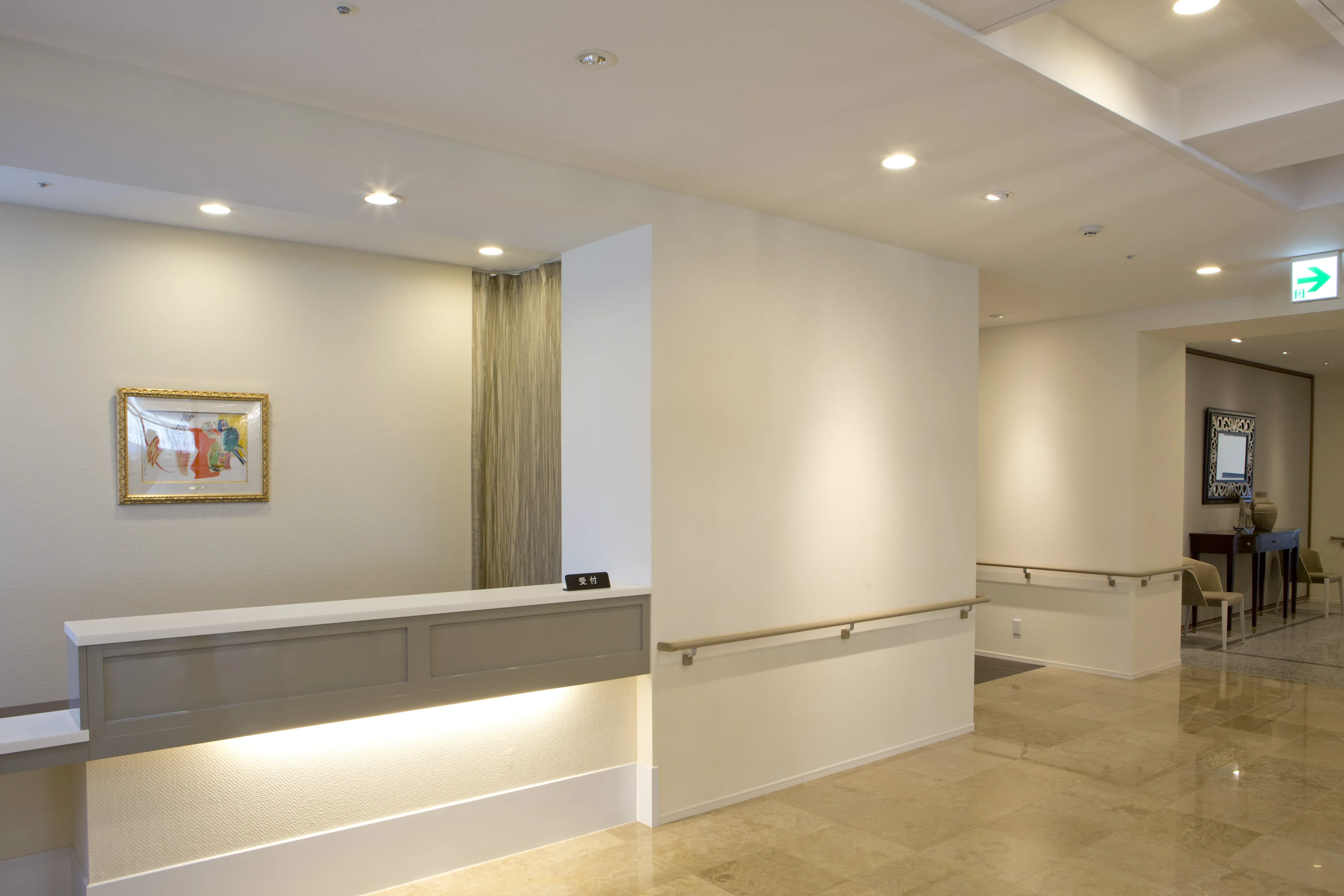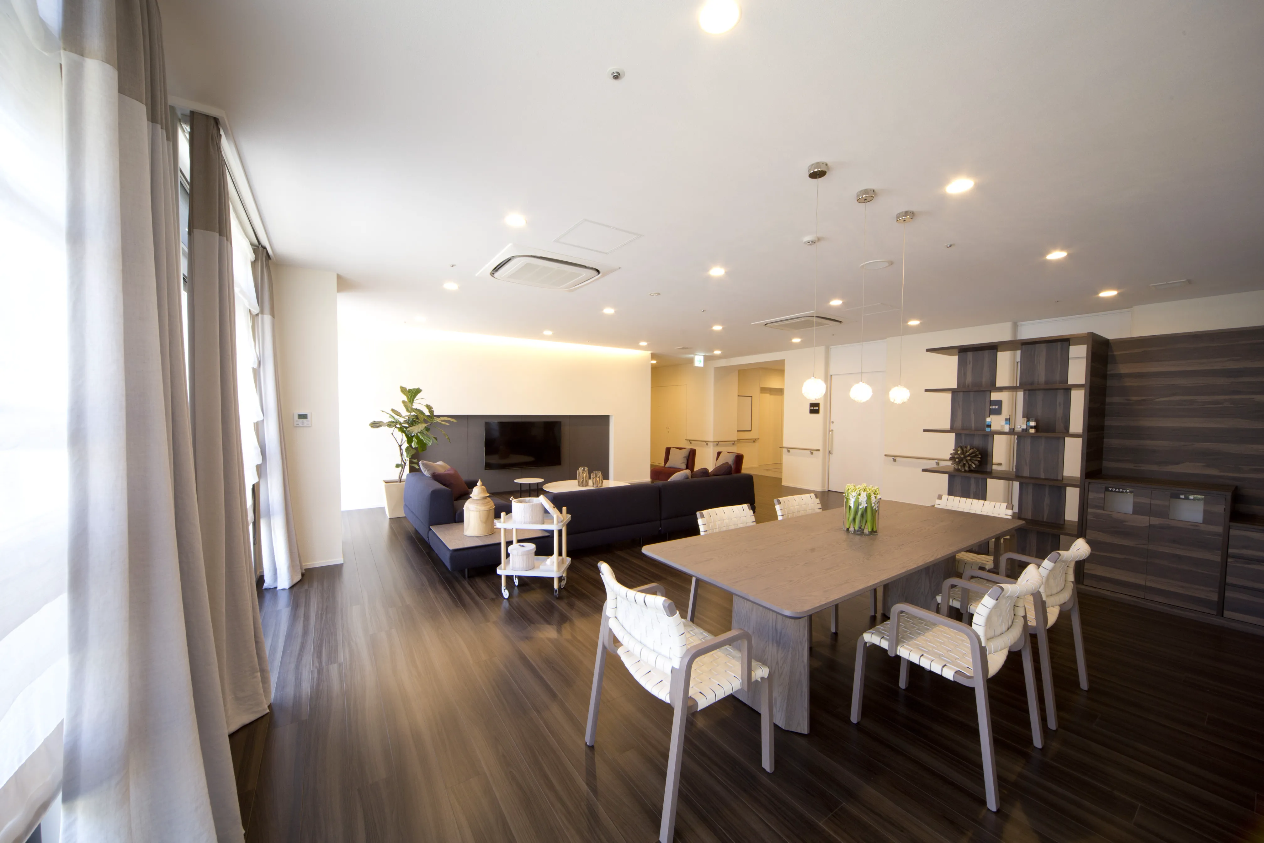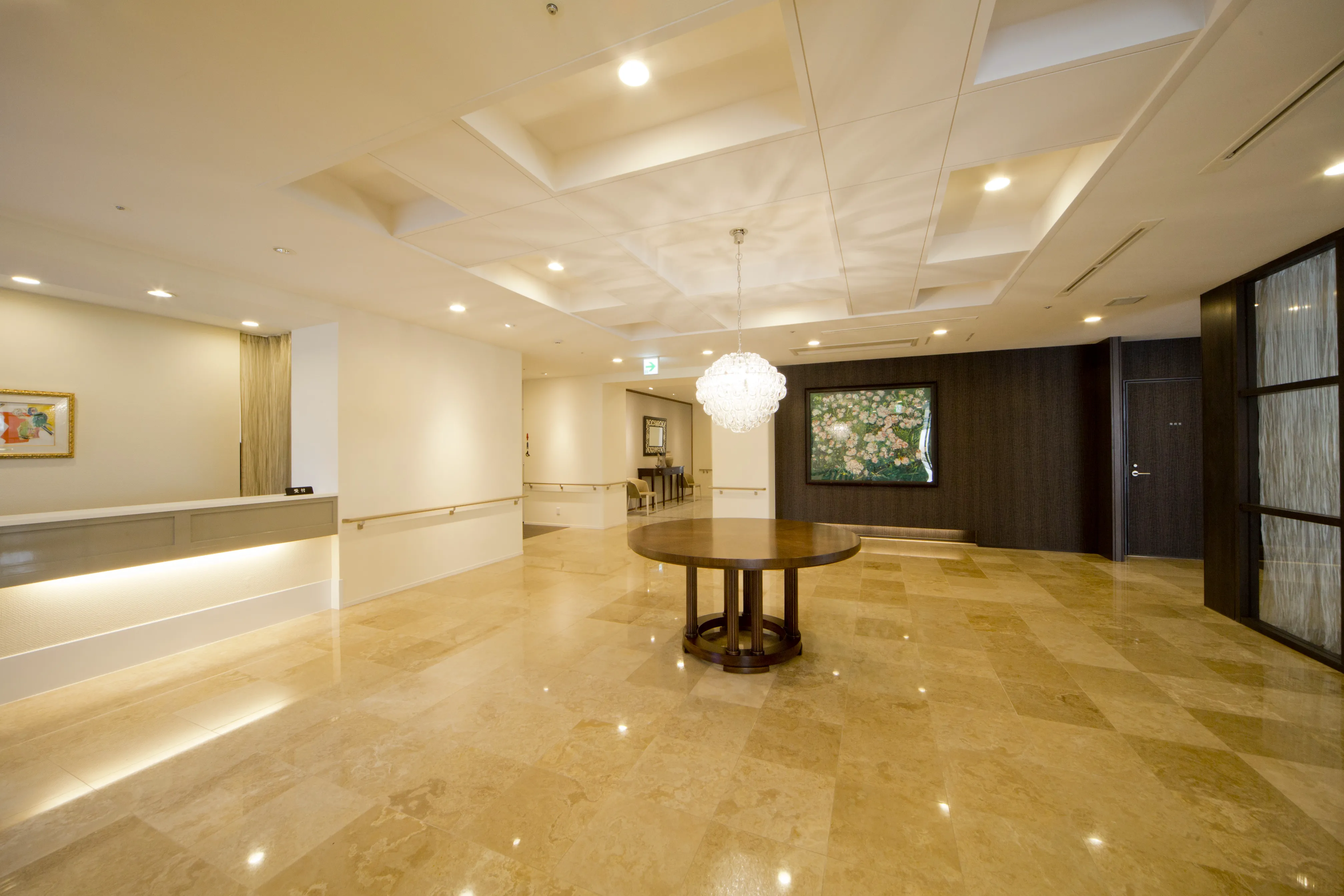 優雅で落ち着きのあるインテリアで統一されたコモンスペース。福祉の先進国スウェーデンに学んだ「情緒的価値(ここち良さ)」を取り入れてここちよい空間づくりを追求しました。アートやグリーンを設置することも空間を構成する大切な要素です。情緒的な価値を高めることこそ、「快適に住まうコト」につながると考えます。