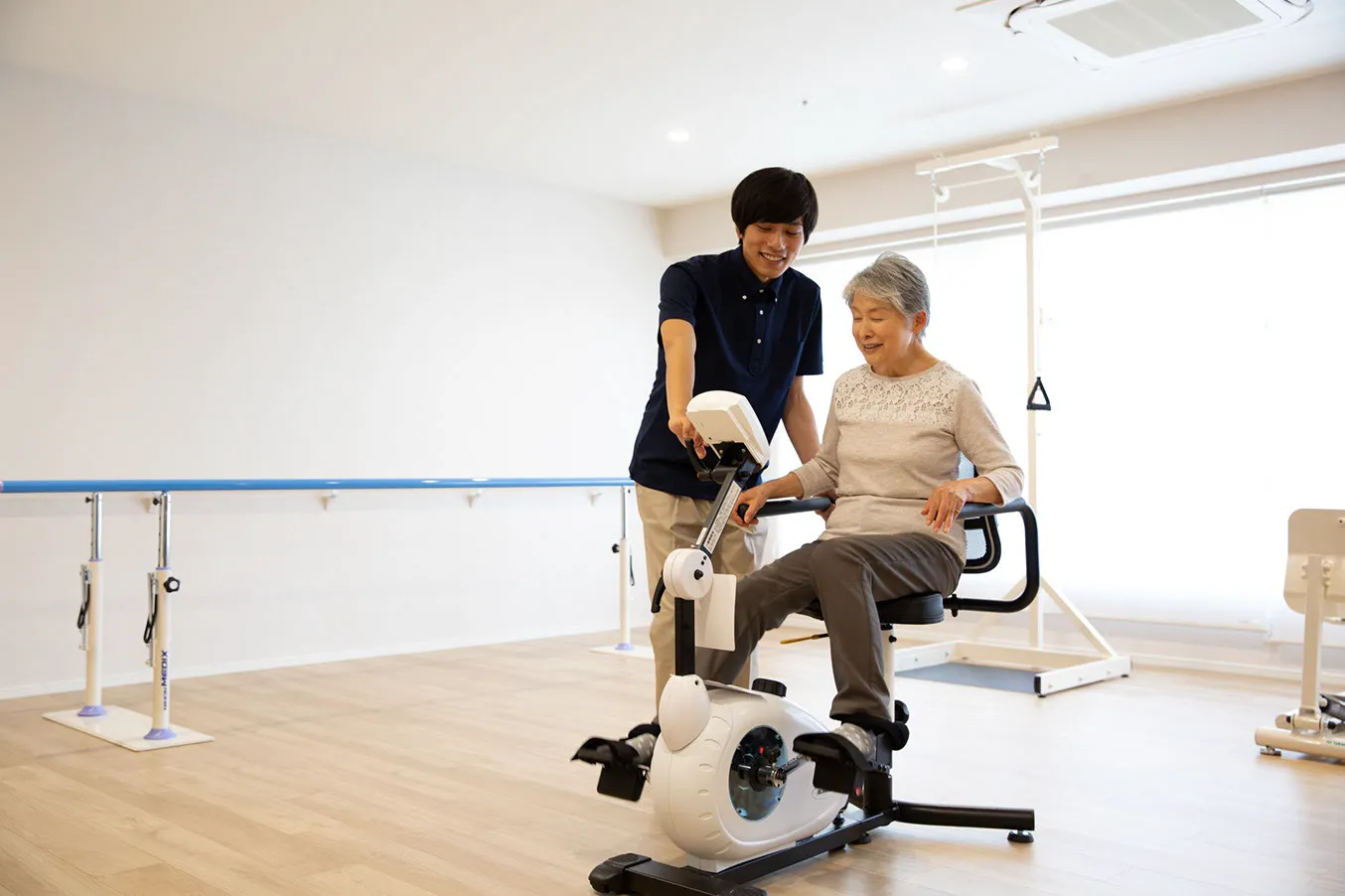 リハビリの専門知識を有する国家資格の機能訓練指導員が対応し、ご入居者様であればどなたでもご参加いただける身体機能の維持・向上を目的としたグループリハビリのほか、お身体の状況に応じてリハビリ計画を立て、マンツーマンで行う個別リハビリもご利用いただけます。