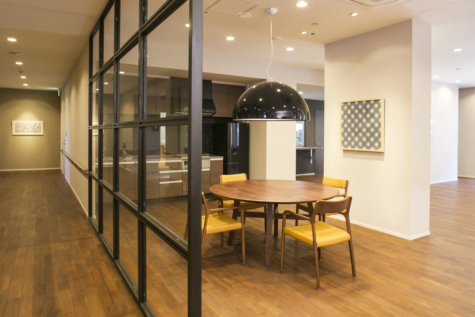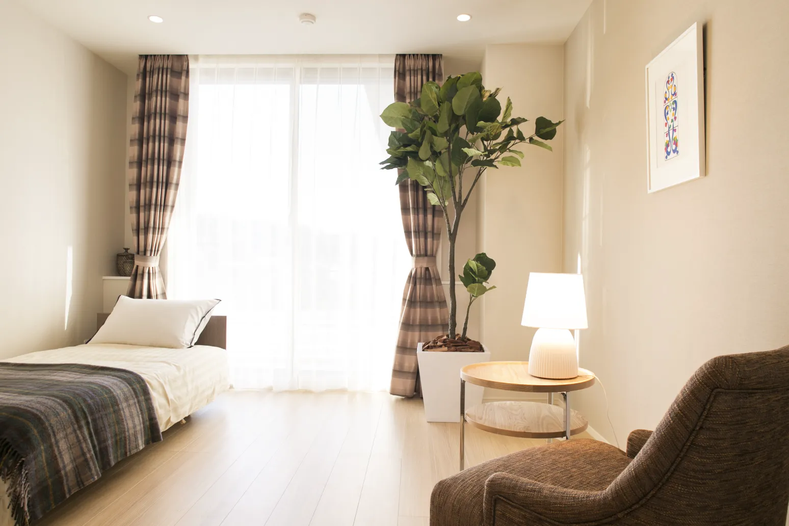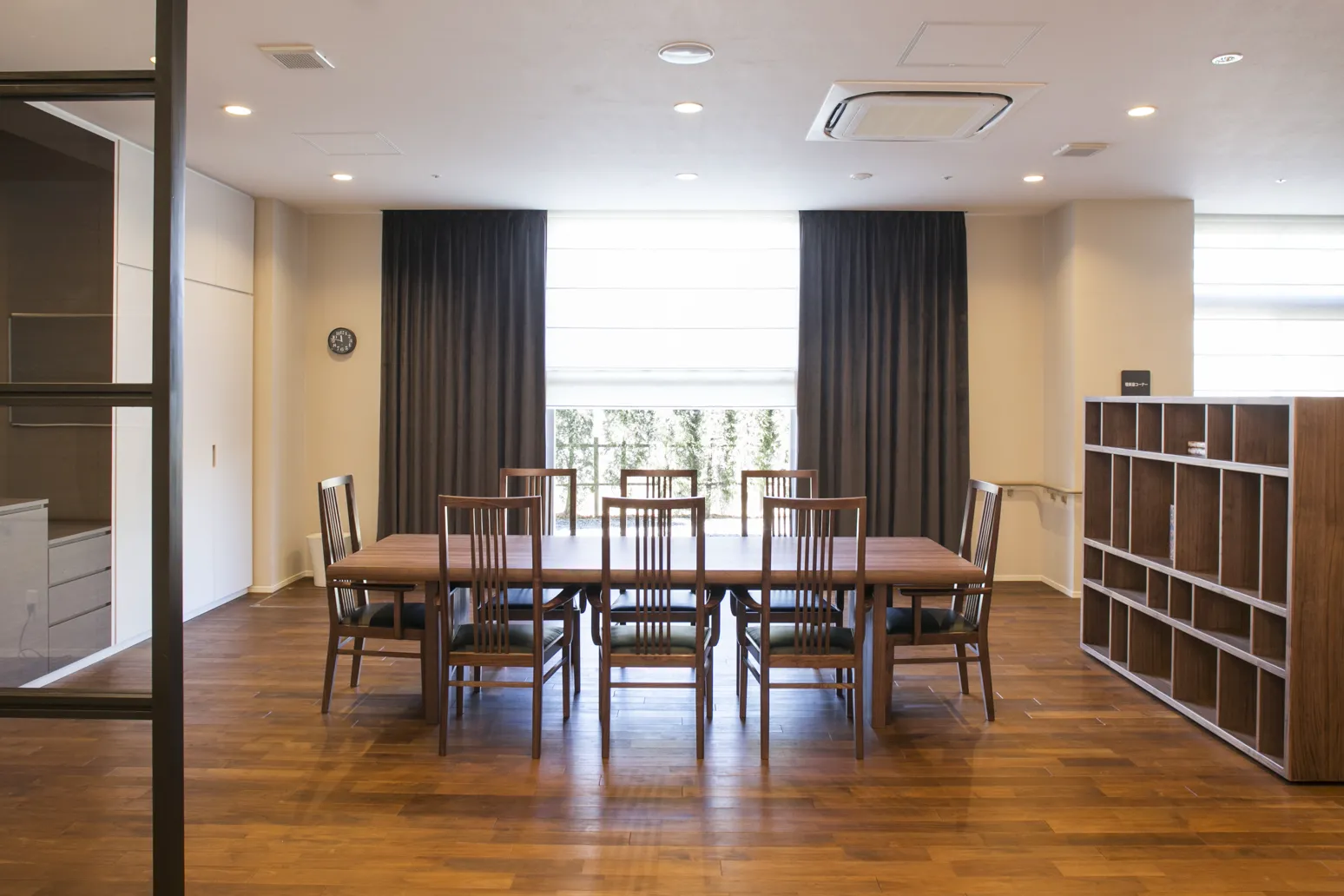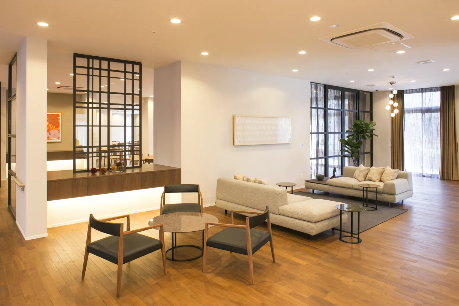 優雅で落ち着きのあるインテリアで統一されたコモンスペース。四季折々に表情を変え、風と光をとりこむ大きな窓。福祉の先進国スウェーデンに学んだ「情緒的価値(ここち良さ)」を取り入れてここちよい空間づくりを追求しました。