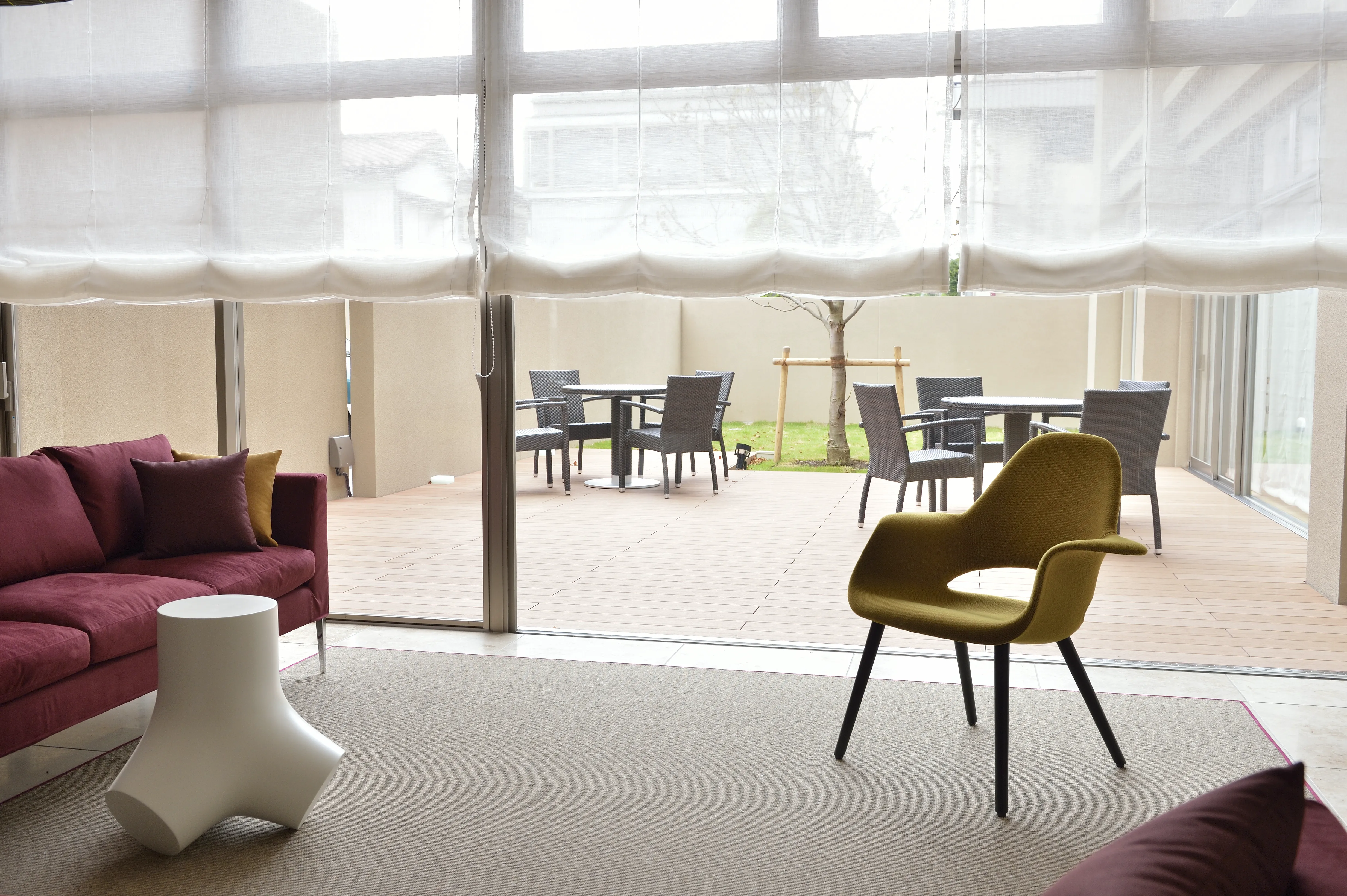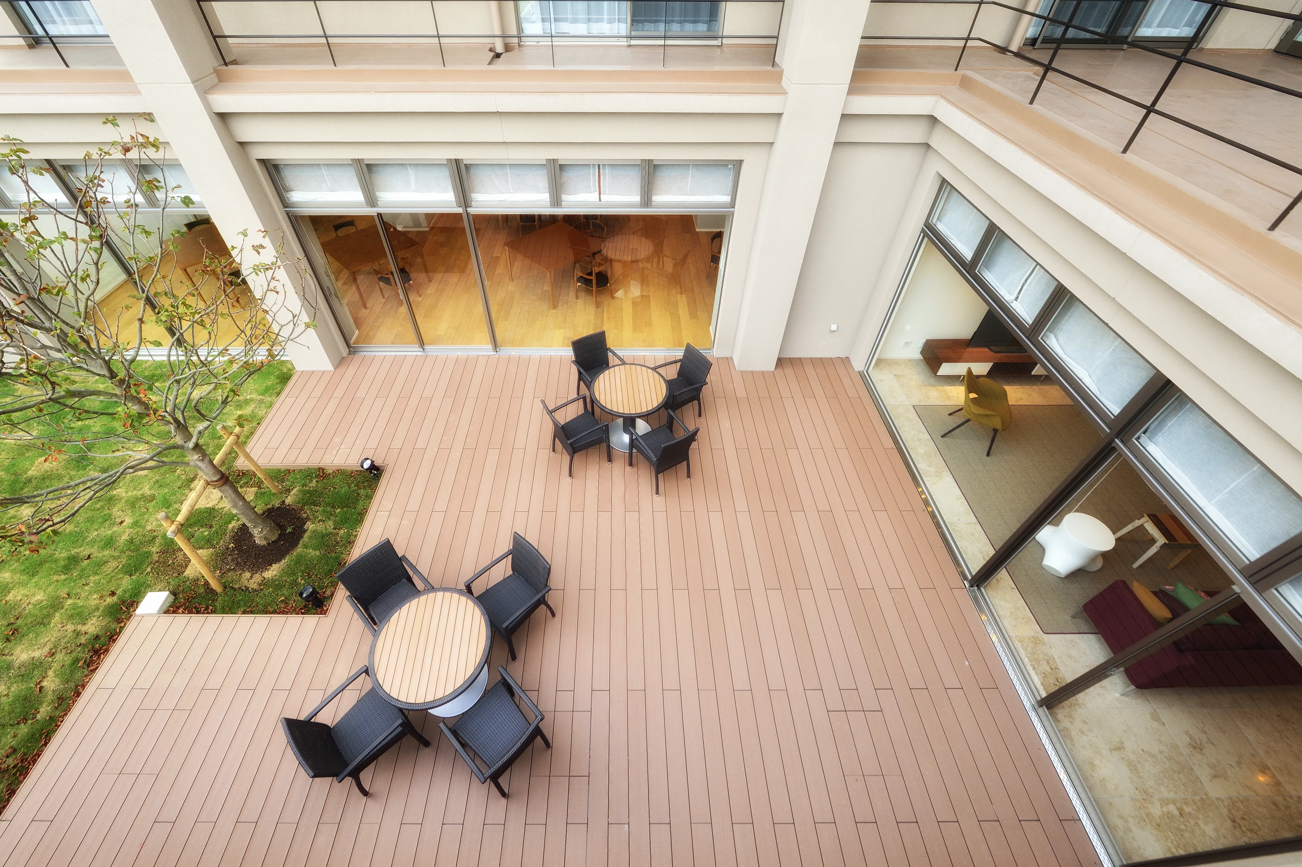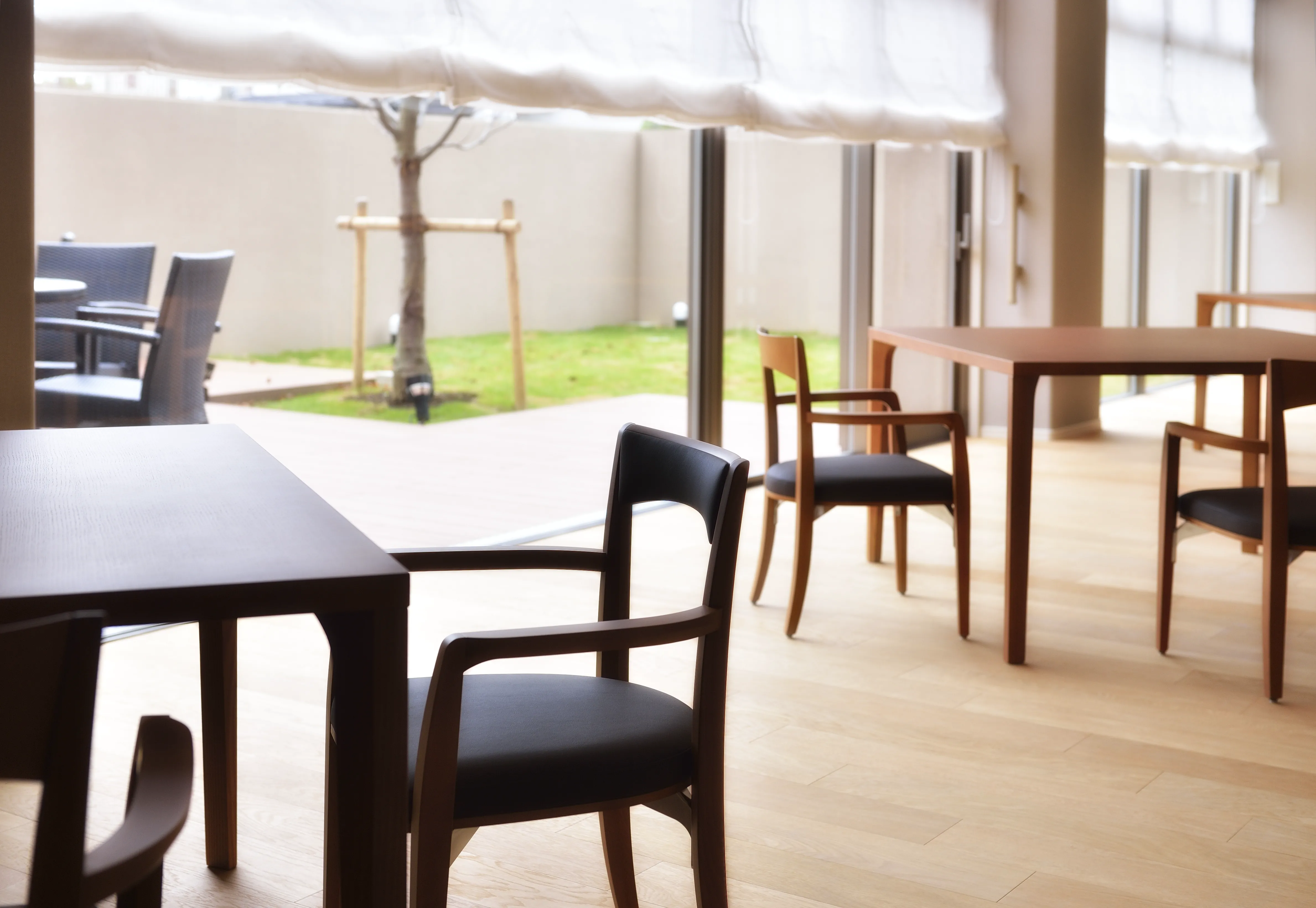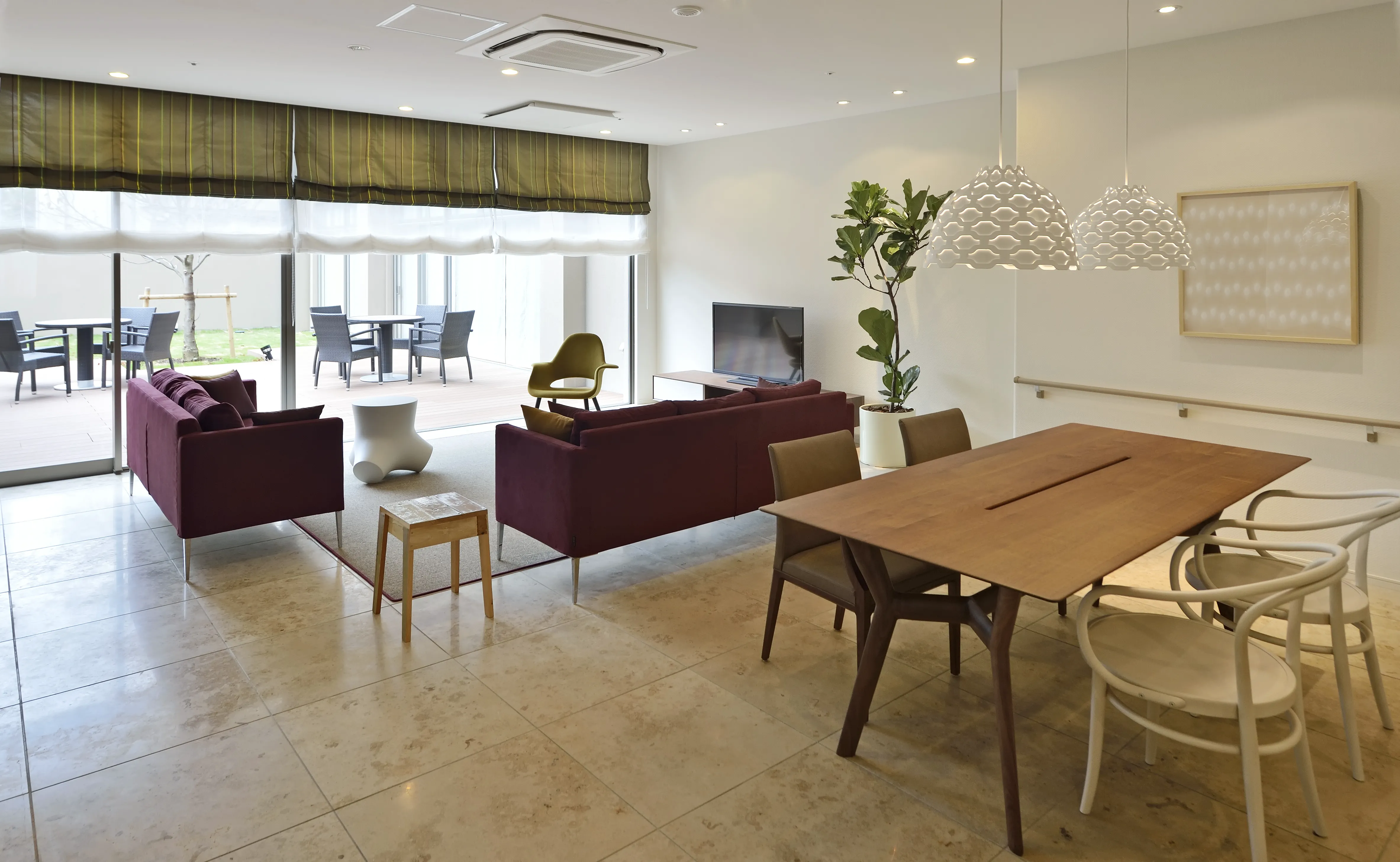施設内は、毎日お過ごしいただくスペースだからこそ、居住性と快適性にこだわりました。ラウンジやダイニングホールは広めにとり、選び抜かれた家具調度品を配置。ラウンジから臨む“パティオ”で思い思いの時間をお過ごしください。