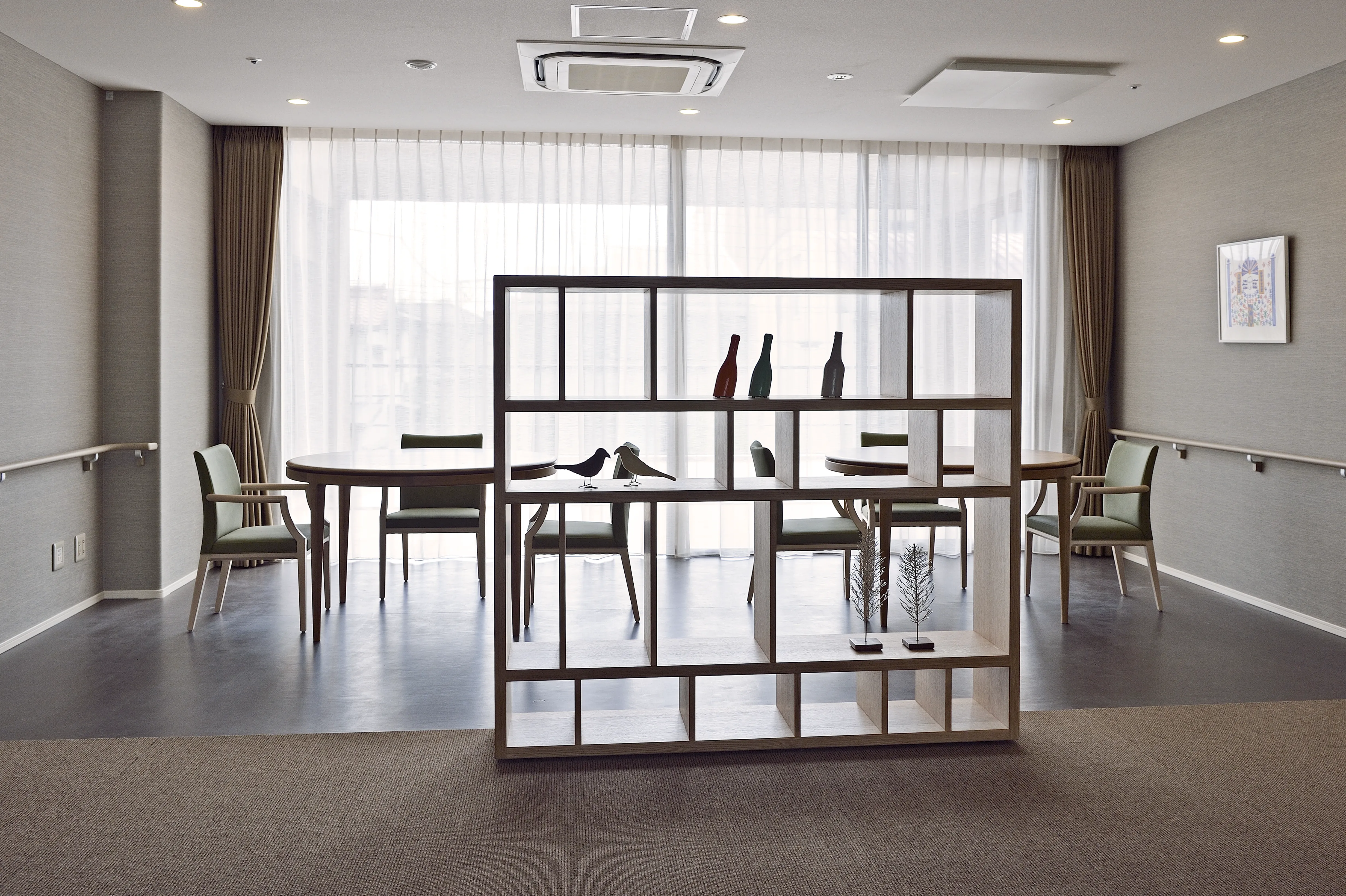 優雅で落ち着きのあるインテリアで統一されたコモンスペース。四季折々に表情を変え、風と光をとりこむパティオ(中庭)が空間の広がりと一体感を演出します。福祉の先進国スウェーデンに学んだ「情緒的価値(ここち良さ)」を取り入れてここちよい空間づくりを追求しました。